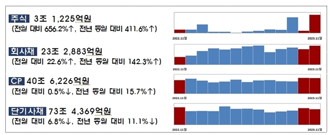 금융감독원이 21일 발표한 '11월중 기업의 직접금융 조달실적'에 따르면 지난달 주식 발행은 3조1225억원으로 전월(4129억원)보다 2조7096억원(656.2%) 증가했다.