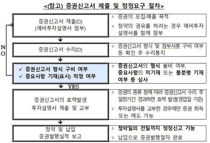 기재하지 않은 내용은 효력 발생일 전날까지 기재 내용을 보완해야 하고, 변동사항이 있으면 청약 전일까지 정정할 수 있다. 금감원은 또 투자계약증권과 관련해서도 투자위험 기재 요령을 명확히 했다.