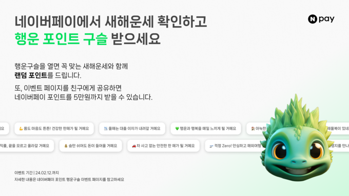 네이버페이 사용자라면 누구나 용의 해를 기념해 '포인트받아용'이 주는 행운구슬을 받을 수 있으며, 구슬 안에는 새해 운세와 랜덤 포인트 혜택이 담겨있다. 포인트는 24원부터 2024원까지 랜덤으로 뽑을 수 있고, 최대 3번까지 운세와 포인트를 바꿀 수 있는 기회가 제공되며 포인트는 한 번만 지급된다.