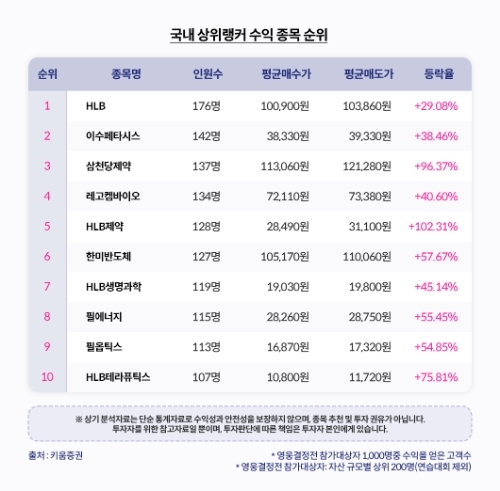 상위랭커들은 바이오 섹터를 적극 공략했다. 많은 수의 상위랭커가 투자 수익을 얻은 종목 10위 안에 HLB 그룹주(HLB, HLB제약, HLB생명과학, HLB테라퓨틱스)만 4개가 포함됐다. 월말 가파른 상승이 나온 삼천당제약과 월초 강세를 보였던 레고켐바이오 투자로 수익을 챙긴 상위랭커도 각각 130명 이상이었다.