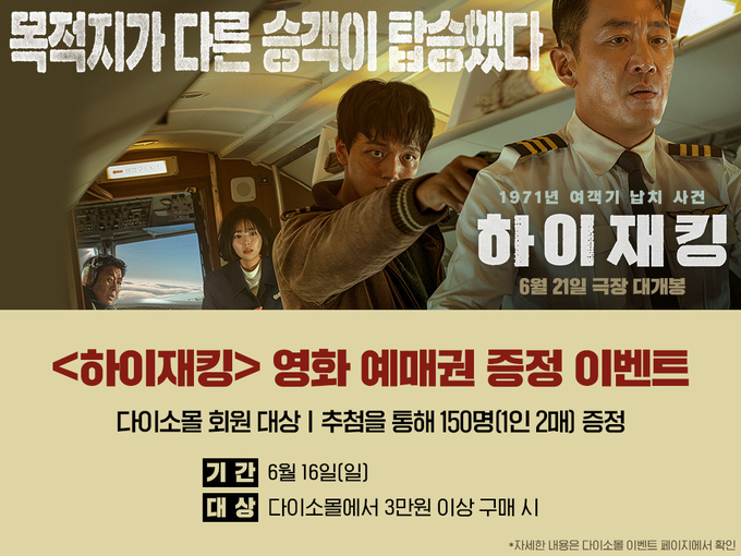 이번 이벤트는 다이소몰에서 3만원 이상 구매 시(상품금액 기준) 자동으로 응모된다. 추첨을 통해 오는 21일 개봉예정인 하이재킹 영화 예매권을 총 150명에게 1인당 2매씩 준다.