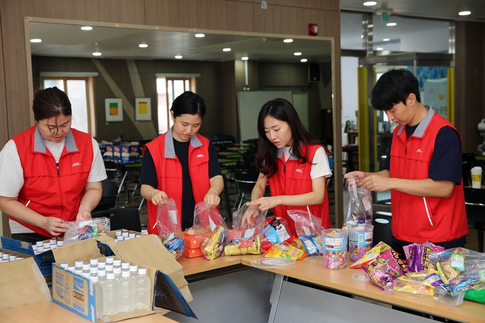 [FETV=장기영 기자] ABL생명은 지난 26일 서울 관악구에 위치한 아동복지시설 상록보육원에서 봉사활동을 실시했다. ABL생명 임직원 17명은 이날 보육원 내외부 시설을 청소하고, 아동들을 위한 간식을 포장했다. 봉사활동에 참여한 직원들이 아동들에게 나눠줄 과자와 음료 등 간식을 포장하고 있다. [사진 ABL생명]