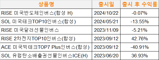 이외에 지난해 11월 달러선물지수를 역방향 추종하는 'RISE 미국달러선물인버스'는 지난 22일까지 -5.21% 하락했다. 원달러 환율의 최근 상승 추세가 반영됐다. 올해 5월에도 인버스 ETF가 출시됐다. 'SOL 미국테크TOP10인버스(합성)'는 출시 이후 약 5개월간 -13.55% 하락했다. 아울러 지난 22일 출시된 'RISE 미국반도체인버스(합성 H)'는 당일 -0.07% 상승률을 기록해 보합 출발했다.