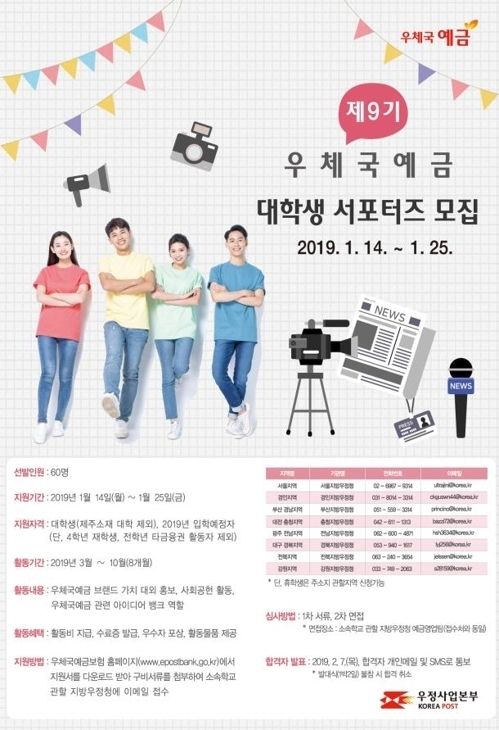[FETV=오세정 기자] 우정사업본부는 오는 14일부터 25일까지 제9기 우체국예금 대학생 서포터즈를 모집한다고 13일 밝혔다.