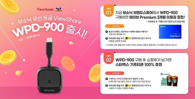 뷰소닉은 뷰쉐어 출시 기념 특별 이벤트를 진행한다. 공식 네이버 브랜드 스토어를 통해 뷰쉐어를 구매한 고객 전원에게 웨이브 프리미엄 3개월 이용권을 증정한다. 구매 확정 후 1개월 이내 순차적으로 발송되며, 카카오톡 채널 ‘연화미디어’ 친구 추가 후 이용권 신청이 가능하다. 추가로 사진 3장 이상, 글 30자 이상의 포토 후기 작성 고객에게는 스타벅스 기프티콘도 증정한다.