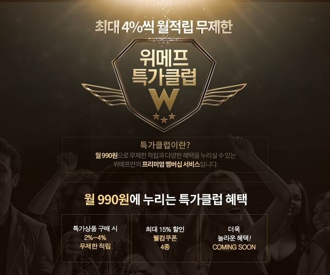 김지훈 위메프 300실 실장은 “위메프의 특가상품을 믿고 찾아주신 단골고객에게 더 많은 혜택을 드리기 위해 특가클럽 멤버십을 선보인다”며 “멤버십 회원의 부담은 크게 줄이고 혜택은 키운 특가클럽을 통해 위메프의 특가 서비스가 한층 더 진화할 것”이라고 기대했다