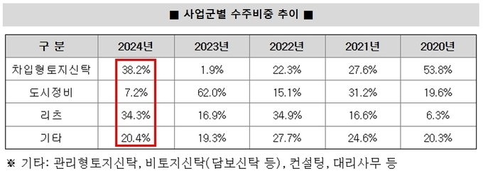 2024년 말 기준 차입형 토지신탁 비중은 38.2%로 가장 높고 이어서 리츠(34.3%), 기타(20.4%), 도시정비(7.2%) 순이다. 차입형 토지신탁은 2020년 전체 수주의 절반을 담당했으나 점차 줄어 2023년에는 2%에도 미치지 못했다. 그러다 지난해부터 다시 비중이 늘어났고 2025년 상반기 다시 55.8%를 달성하며 제자리를 찾은 모양새다.