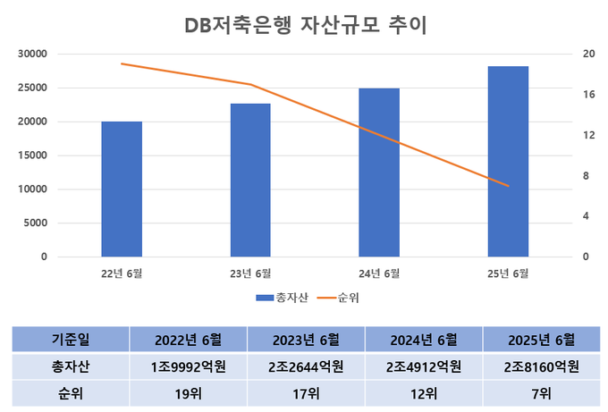 DB저축은행은 자산 성장세를 지속하며 수익성 확대의 발판을 마련하고 있다. 지난해 상반기 79개 저축은행 중 12위였던 자산 규모가 올 상반기에는 7위로 올라서며 1년 만에 5계단 상승했다. 같은 기간 총자산은 2조4912억원에서 2조8160억원으로 증가했다. 저축은행은 여·수신으로 구성된 자산 규모를 업계 순위의 잣대로 삼는다. 자산이 곧 영업력과 수익성을 가늠하는 핵심 지표이기 때문이다.