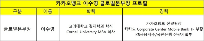 조직을 이끄는 인물은 이수영 글로벌본부장이다. 이 본부장은 KB금융지주와 KB국민은행 전략기획부를 거쳐 카카오뱅크 초창기 설립 단계부터 참여한 인물이다. 카카오 그룹 내에서는 카카오 Corporate Center Mobile Bank TF 부장, 카카오뱅크 전략팀장을 역임했으며 글로벌팀이 2023년 신설되면서 글로벌팀장을 맡게 됐다.