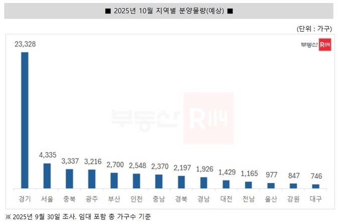 10월 전국 아파트 분양시장은 57개 단지, 총 5만1121가구(임대 포함)가 분양에 나설 것으로 예상된다. 수도권은 ▲경기 2만3328가구 ▲서울 4335가구 ▲인천 2548가구 등 3만211가구가 공급된다. 지방에서도 ▲충북 3337가구 ▲광주 3216가구 ▲부산 2700가구 ▲충남 2370가구 등을 포함해 총 2만910가구가 분양을 앞두고 있다.