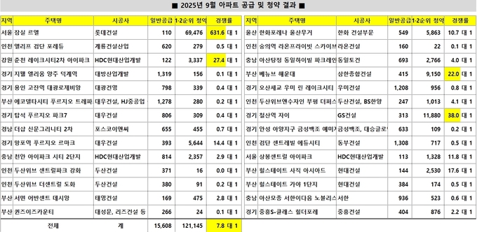 9월 전체 청약 경쟁률은 일부 국민주택 단지를 제외한 상태에서 단순 평균으로 7.8대 1을 기록하며 8월(7.8대 1)과 유사한 흐름을 보였다. 다만 지방 일부 단지는 청약이 공급 물량을 채우지 못해 건설사들의 향후 분양 전략에 변화가 필요한 상황이다.