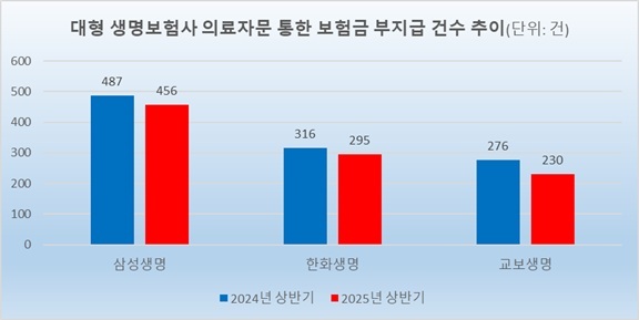 13일 생명보험협회에 따르면 삼성생명, 한화생명, 교보생명 등 3개 대형 생보사의 올해 상반기 의료자문을 통한 보험금 부지급 건수는 981건으로 전년 동기 1079건에 비해 98건(9.1%) 감소했다.