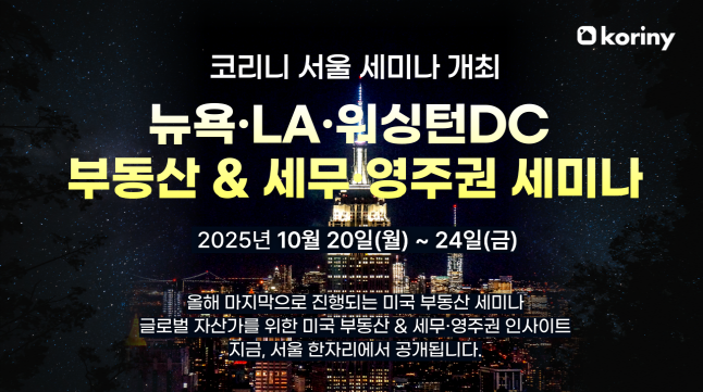 [FETV=장명희 기자] 미국 부동산 전문 플랫폼 코리니(Koriny)가 오는 10월 20일(월)부터 24일(금)까지 서울 역삼 및 삼성동에서 ‘2025 미국 부동산 & 세무·영주권 세미나’를 개최한다. 이번 세미나는 뉴욕·LA·워싱턴DC 등 미국 핵심 도심의 부동산 시장 전망부터 미국·국내 세무 전략, 영주권 취득 인사이트까지 투자자가 꼭 알아야 할 실질적인 정보를 한 자리에서 제공한다.