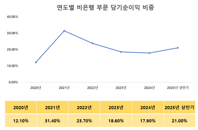 앞서 BNK금융은 2023년까지 비은행 수익 비중을 30%로 끌어올린다는 내용의 중장기 전략 'GROW 2023'을 발표한 바 있다. 다만 이러한 목표에도 불구하고 2023년 비은행 부문 비중은 18.6%로 2022년(23.7%)보다 5.1%포인트(p) 감소했다.