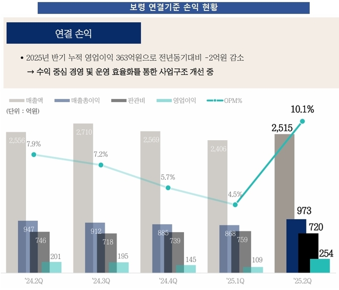 이러한 실적은 올해 경영전략으로 내세운 ‘손익구조 개선’과 다른 결과다. IR자료에 따르면 2025년 경영전략으로 보령은 자가제품력 극대화, 시장점유율 확대, 손익구조 개선, 제조역량 강화를 내세웠다. 핵심 사업 집중과 원가절감으로 손익구조를 개선하겠다는 방침이다.