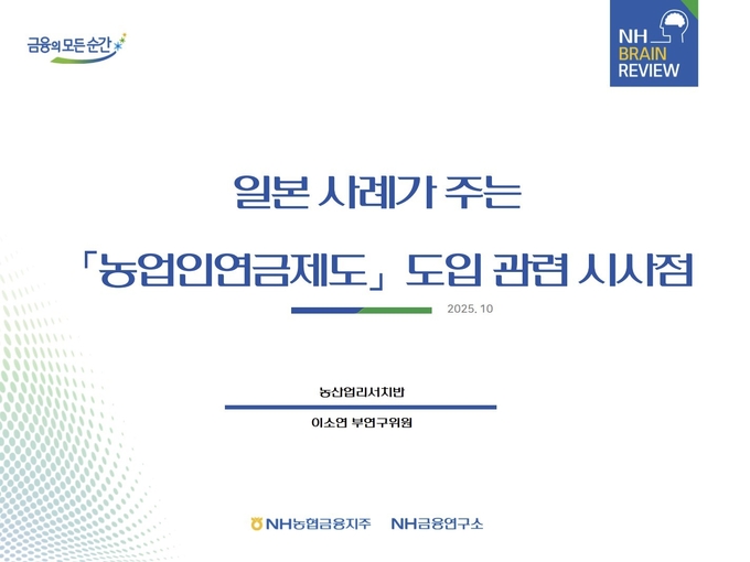 이에 NH금융연구소는 한국형 농업인연금제도 설계 시 ▲한국 농업의 현실을 감안한 은퇴 기준 정립 ▲농업인 소득 수준을 반영한 차등 지원 체계 등을 핵심 설계 원칙으로 제시했다.