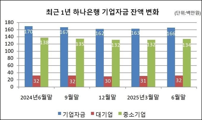 이중 기업자금 대출 잔액은 166조원으로, 전년 동기보다 2.3% 감소했다. 하나은행의 기업자금 대출 잔액은 지난해 상반기 말 170조원을 넘어선 이후 12월 말까지 감소세를 유지했다. 올해 1분기부터는 증가하기 시작했다.