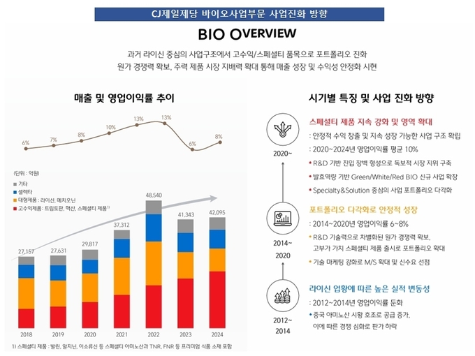 이에 따른 대응으로 2020년부터 R&D 기반 진입 장벽 형성으로 독보적 시장 지위를 구축, 발효역량 기반으로 그린, 화이트, 레드바이오 신규 사업을 확장해나갔다. 2020년부터 2024년까지 영업이익률 평균 10%를 기록하는 등 해당 시기를 지속 성장 가능한 사업구조 확립한 기간으로 정의했다.