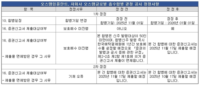 최근 오스템임플란트는 자회사 오스템글로벌 흡수합병 결정에 대해 기재정정 공시를 냈다. 올해 9월 초에는 신주 발행 대상이 50인 미만, 합병신주 발행 즉시 한국예탁결제원에 1년 간 보호예수를 설정할 예정으로 증권신고서 제출이 면제됐다가 이를 변경했기 때문이다.