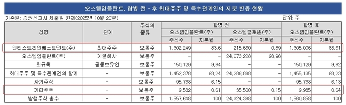 2025년 1월에 탑플란을 흡수합병한 건은 합병신주를 발행하지 않는 무증자합병 방식으로 진행하기 때문에 증권신고서 제출이 필요하지 않았다. 다만 이번 오스템글로벌 흡수합병은 비율에 따라 합병 후 신주가 발행되는 유증자 방식을 택했다.