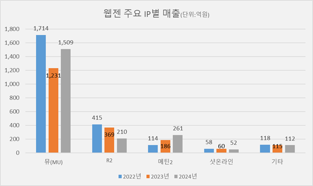 하지만 2023년부터 성장세가 다시 둔화됐다. 2023년 매출은 1962억원으로 전년 대비 18.9% 감소했고, 영업이익은 499억원으로 39.9% 급감했다. 신작 부재로 ‘뮤 온라인’, ‘R2’, ‘메틴2’ 등 기존작 매출이 줄은 와중에 매출의 70% 이상이 ‘뮤’ IP에 집중되면서 IP 집중 리스크가 커졌다.