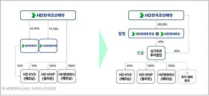 또 싱가포르 투자법인을 신설해 기존의 복잡한 해외 법인 구조를 단순화하고 추가 해외 야드 개발을 노린다. 합병은 중형선박 분야를 담당하는 HD현대미포가 HD현대중공업에 흡수되는 형식으로 진행된다. 합병은 오는 12월을 기점으로 마무리 될 예정이다.
