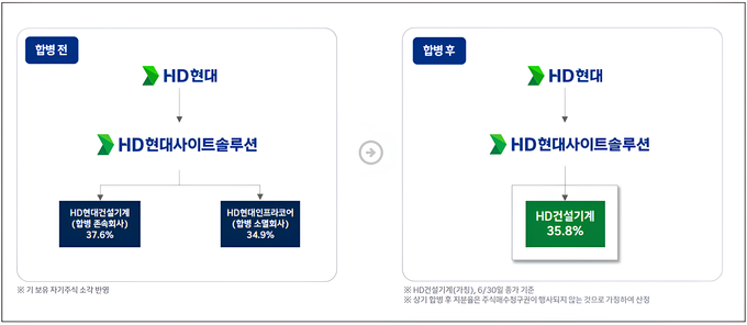 현재 HD현대는 두 건의 핵심 합병 절차를 진행 중이다. 조선·해양 부문에서는 HD현대중공업과 HD현대미포의 합병이 진행중이고 기계·로봇 부문에서는 HD현대건설기계와 HD현대인프라코어의 합병이 추진되고 있다. 두 합병 모두 사업 중간지주사인 HD한국조선해양과 HD현대사이트솔루션이 직접 관리하는 체계로 이뤄진다.