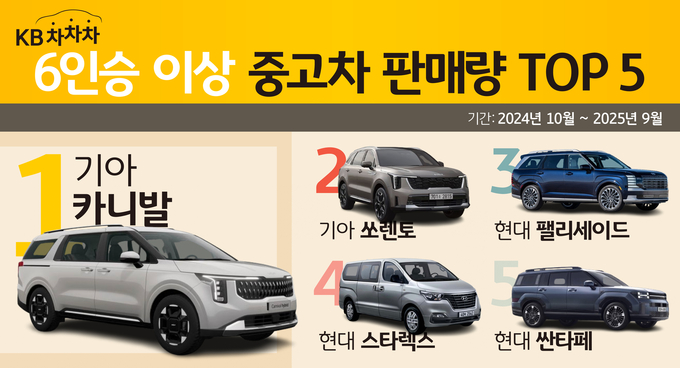 [FETV=임종현 기자] KB캐피탈이 운영하는 자사 중고차 거래 플랫폼 KB차차차가 지난해 10월부터 1년간 KB차차차에서 판매된 6인승 이상 중고차 데이터를 분석한 결과 기아 카니발이 1위를 차지했다고 밝혔다.