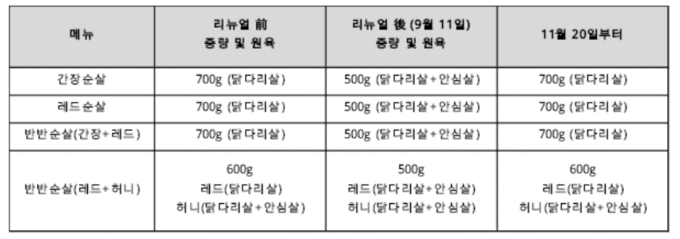 나머지 ▲반반순살(레드+허니)은 기존 중량인 600g과 기존 원육 구성으로 되돌리기로 결정했다(표 참고). 순살 신메뉴 10종은 단종할 예정이다. 또한 텀블링 방식으로 변경했던 소스 도포 조리법도 기존 붓질 도포로 되돌린다.