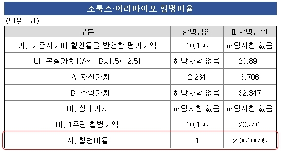 소룩스는 그동안 금융감독원의 정정요구와 자진 기재정정까지 더해 12차례에 걸쳐 증권신고서를 제출했다. 그중 가장 최근인 올해 10월에 공시한 증권신고서에 따르면 소룩스와 아리바이오 간 합병비율을 1:2.0610695로 정해졌다. 1주당 합병가액은 1만136원, 2만891원이다.