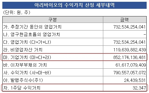 기업가치에서 이자부부채의 가치를 차감하면 7906억원이 된다. 이를 발행 주식 수로 나누면 1주당 수익가치는 3만2347원이라는 값이 나온다. 이를 두고 자산가치(1주당 3706원)와 수익가치를 1과 1.5 비율로 가중산술평균해 아리바이오 주당 합병가액을 2만891으로 정했다.