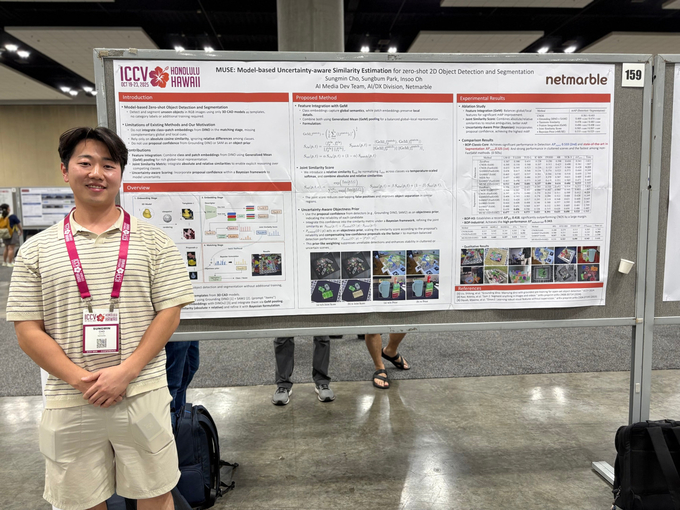 또한 넷마블은 학회 내 사물 인식 워크숍에서 기술 논문 ‘MUSE(Model-based Uncertainty-aware Similarity Estimation)’를 발표했다. 해당 연구는 추가 학습 과정 없이 원하는 객체를 인식하고 분할할 수 있는 방법을 제시해 관심을 모았다.