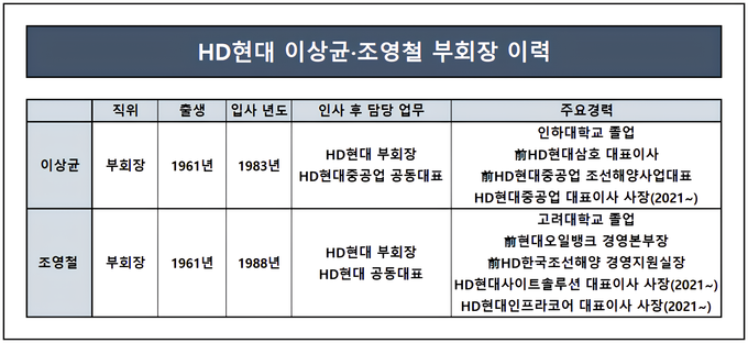 지난 17일 진행된 HD현대의 사장단 인사에서 이상균 HD현대중공업 사장과 조영철 HD현대사이트솔루션 사장이 부회장으로 승진했다. 두 인물 모두 1961년생으로 HD현대의 주요 계열사에서 주요직을 맡으며 40년 가까이 근무해온 탄탄한 경력의 내부 인사로 평가된다.
