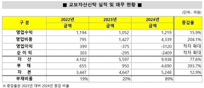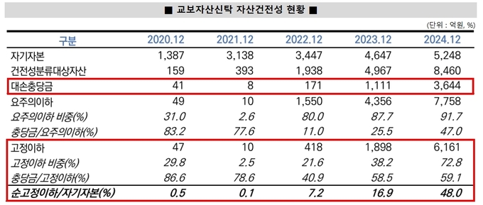 자산건전성도 위태롭다. 교보자산신탁의 고정이하자산은 6161억원, 순고정이하자산/자기자본 비율은 48%, 부채비율은 89.4%로 위험 수위에 도달했다. 신용평가사들은 충당금도 3644억원을 적립했지만 충당률은 59.1%에 불과해 업계 평균을 밑돌고 있다고 지적한다.
