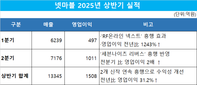 상반기 기준으로는 매출 1조3345억원을 기록하며 전년 나혼자만 레벨업 흥행 효과에 한 끝차이로 못미쳤지만 영업이익은 1508억원으로 전년 대비 31.2% 증가하며 2개의 신작이 흥행한 효과를 확실히 입었다.