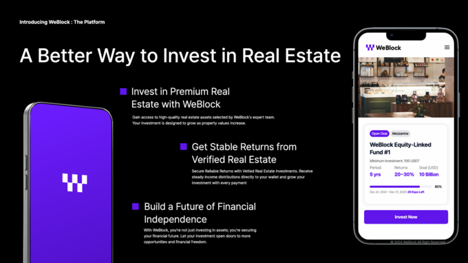 [FETV=이건혁 기자] 실물자산(RWA) 토큰화 플랫폼 위블록(WeBlock)이 변동성 높은 가상자산 시장에 신뢰와 안정성을 더할 독점 AI 스테이킹 알고리즘을 공식 발표했다. 이 혁신적인 엔진은 CEO의 AI 공학 박사학위 논문과 MSCI(모건스탠리)의 기관 등급 데이터를 기반으로 개발되어, ‘더 스마트하고 안전한’ 실물 연계 수익 창출의 새로운 표준을 제시한다.