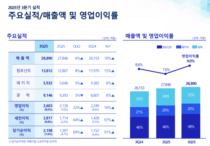 광학솔루션 부문(카메라 모듈)의 3분기 매출은 9146억원으로 전분기 대비 소폭 감소했으나 전년 동기 대비 약 6% 증가했다. 해외 거래선향 IT용 카메라 모듈 수요는 감소했지만 전략 거래선향 2억 화소 슬림 OIS 및 폴디드줌 등 고성능 카메라 모듈 공급이 확대됐으며 전장용 카메라 모듈 라인업 확대가 매출 증가를 이끌었다.