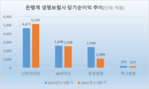 반면, KB라이프, 동양생명, 하나생명 등 다른 은행계 생보사의 당기순이익이 나란히 감소했다.