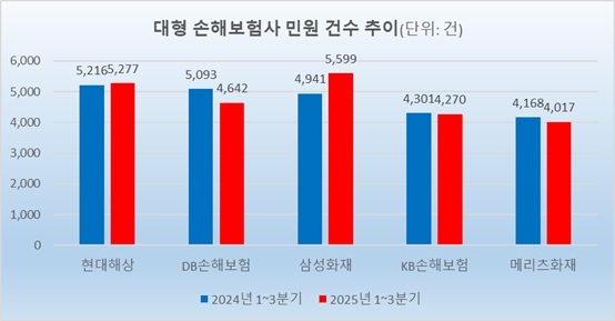 5일 손해보험협회에 따르면 삼성화재, DB손해보험, 메리츠화재, 현대해상, KB손해보험 등 5개 대형 손보사의 올해 1~3분기(1~9월) 민원 건수는 2만3805건으로 전년 동기 2만3719건에 비해 86건(0.4%) 증가했다.