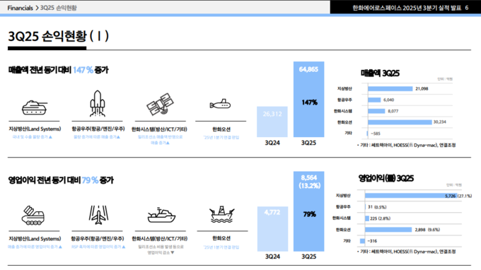 전분기 대비 매출은 2.8% 증가했고 영업이익은 0.9% 감소했다. 전년 동기 대비로는 각각 146.5%, 79.5% 증가했다. 지상방산, 항공우주 부문에서의 국내 및 수출 물량 증가와 한화시스템의 필리조선소 매출액 반영으로 매출액이 전년 동기 대비 대폭 증가했다.