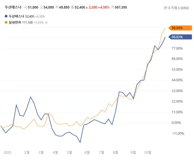 유진투자증권은 “두산테스나 주가는 10월 한 달간 22.8% 상승했다”며 “2025년 기준 PER은 139.9배로, 단기 실적 부진에도 HBM4 시장 확대에 따른 성장 프리미엄이 반영되고 있다”고 평가했다.