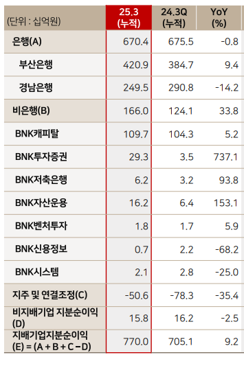 긍정적인 점은 비은행 핵심 계열사인 BNK투자증권의 순이익이 큰 폭으로 늘어난 점이다. BNK투자증권의 3분기 누적 순이익은 293억원으로 전년 동기 대비 737.1% 급증했다. 부동산PF 관련 충당금이 크게 줄어든 영향이 컸다. BNK캐피탈은 1097억원으로 전년 동기 대비 5.2% 증가했다.