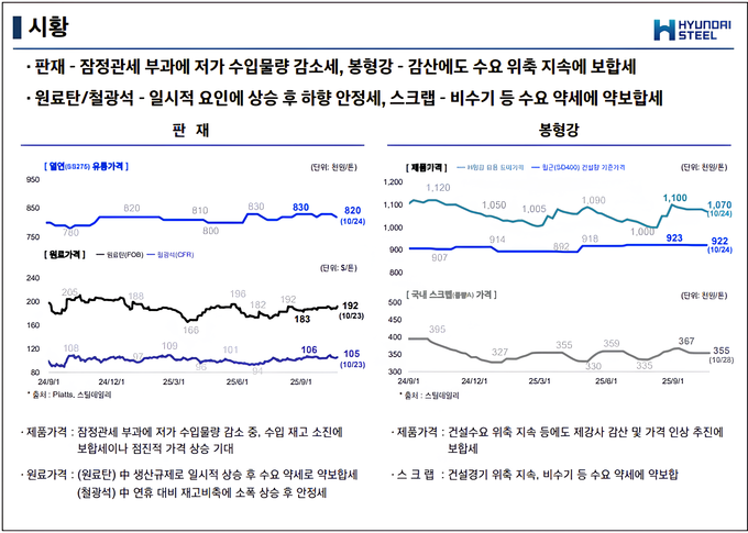 현대제철은 판재 부문에서 냉연 가격이 보합세를 유지하고 있으며 완성차 신차 라인 확대에 따라 2026년 냉연 수요는 올해 수준을 유지할 것으로 내다봤다. 조선용 후판은 중국산 외주화 지속으로 소폭 감소하겠지만 건설용 봉형강은 안전사고 여파로 위축된 뒤 공공주택 공급 확대로 내년 점진적 반등이 가능하다고 전망했다.