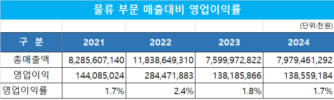 다만 매출 대비 수익성은 여전히 한계가 있었다. 사업보고서에 따르면 물류 부문은 전체 매출의 절반을 차지하면서도 영업이익률이 2%에 못 미쳤다. 2022년 일시적으로 2.4%를 기록했지만, 나머지 연도의 평균 영업이익률은 1.7% 수준에 머물렀다.