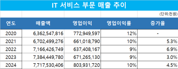 이에 따라 2020년 6조3625억원 수준이던 IT 부문 매출은 2024년 7조7175억원으로 4년 만에 약 21.3% 성장했다.
