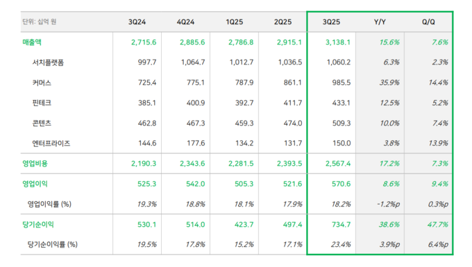 [FETV=신동현 기자] 네이버가 2025년 3분기 연결 기준 매출액 3조1381억원, 영업이익 5706억원, 당기순이익 7347억원을 기록했다고 5일 밝혔다. 매출은 전년동기 대비 15.6%, 전분기 대비 7.6% 증가했고 영업이익은 전년동기 대비 8.6%, 전분기 대비 9.4% 늘어나며 역대 최대치를 달성했다.