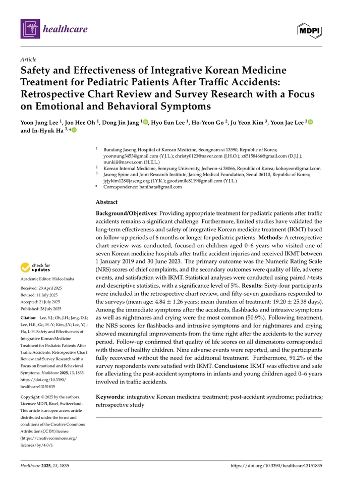 [FETV=김선호 기자] 자생한방병원 척추관절연구소(소장 하인혁)는 소아 교통사고 환자 대상의 한의통합치료 유효성 연구 결과를 SCI급 국제학술지 ‘헬스케어’에 게재했다고 5일 밝혔다.