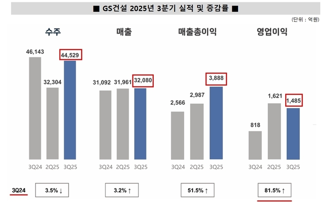 GS건설은 최근 공시를 통해 올해 3분기 연결 기준 매출 3조2080억원, 영업이익 1485억원, 당기순이익 1221억원을 기록했다고 밝혔다. 매출은 전년 동기 대비 3.2% 증가, 영업이익은 81.5%나 급증했다. 영업이익률도 2.6%에서 4.6%로 2%p상승하며 수익성이 크게 개선됐다.