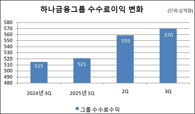 항목별로 수수료이익은 누적 기준 1조6504억원으로 전년 동기보다 6.7% 성장했다. 분기 수수료수익은 2% 늘어난 5700억원이다. 하나금융의 분기 기준 그룹 수수료이익은 올해 들어 증가세를 보이고 있다.
