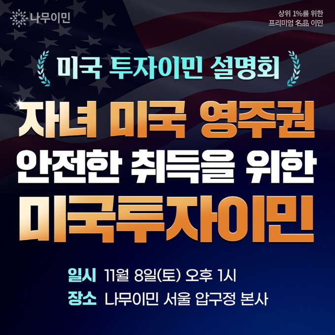 나무이민은 오는 11월 8일(토)과 14일(금) 오후 1시, 서울 압구정 본사에서 EB5 미국 투자이민 전략 설명회를 개최한다. 이번 설명회에서는 ▲Rural 프로젝트를 통한 최단기간 영주권 취득 전략 ▲Urban 대비 10배 빠른 승인 비결 ▲자금출처 증빙 노하우 ▲80만불 인상 전 대응전략 등을 집중적으로 다룰 예정이다.